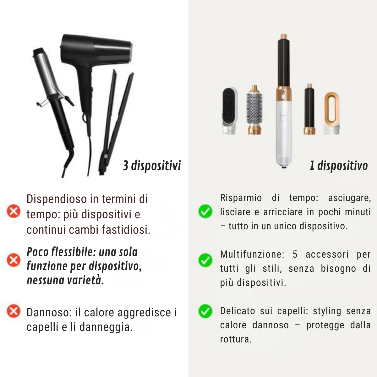 Il Multi Styler 5 in 1 è dotato di diversi accessori intercambiabili: ferro arricciacapelli, spazzola lisciante, pettine riscaldato, ecc.